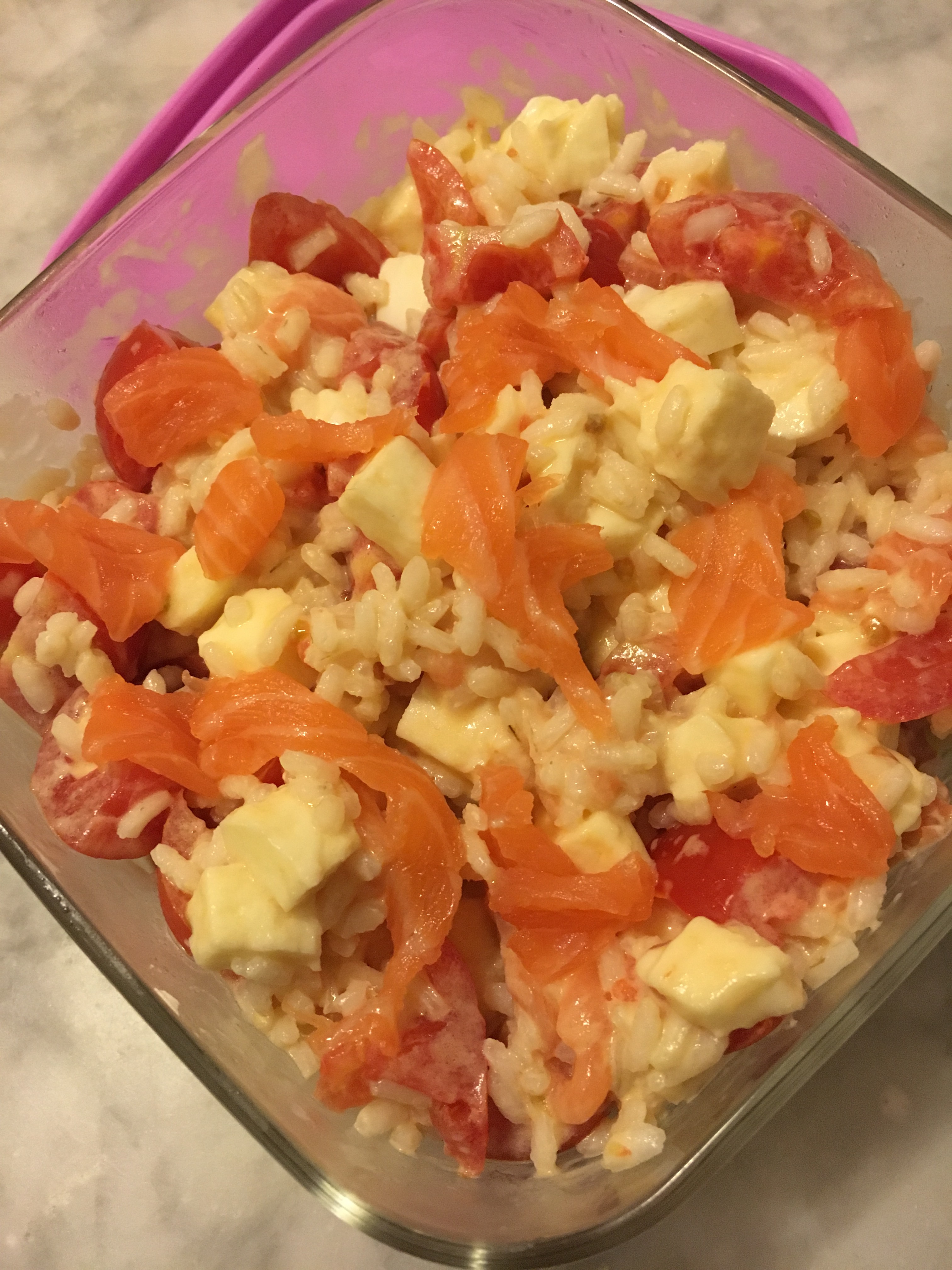 • versalo ora nel contenitore che tu preferisci per la tua schiscia e aggiungi tutti gli altri ingredienti, il salmone, la mozzarella, i pomodorini, la maionese un filo di olio