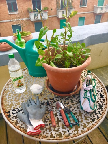 Il meteo ci comincia a regalare qualche scherzetto, la settimana scorsa qui a Milano per un paio di giorni ha fatto un tempo da primavera, si stava bene…ma di un bene…L’opinione comune della maggior parte delle persone, (un po’ vittimista se vogliamo e forse un attimo “sfigatella”n.d.r.), è quella di associare questo alternarsi e avvicendarsi di giorni con temperature a volte miti che poi tornano ad essere fredde, a dei curiosi scherzi che il meteo ci tira di proposito, come se lui, non avendo niente altro di meglio da fare, se la venisse a prendere con noi. A me piace pensare che invece che ci stia garbatamente avvisando, come se volesse ricordarci che tra un po’ inizia quella meravigliosa stagione di rinascita dove tutto riprende vita dopo il sornione autunno e il freddo inverno. E così riprendiamo quota anche noi, corriamo a rimetterci in forma seguendo diete, tornando a fare sport all’aria aperta, si esce di più e quindi si favoriscono gli incontri, i vestiti diventano più leggeri e di meno percui ci fa piacere apparire in forma e tonici, ripartono le gite fuori porta, le bici, e….chi più ne ha più ne metta. Anche le nostre terrazze e i nostri giardini cominciano a rifiorire e anche loro come noi hanno bisogno di essere preparati e curati per l’occasione, abbandonati un po’ lì da due stagioni, qualcosa sarà anche passato a miglior vita lasciando spazio solo a delle belle erbacce, che vanno estirpate. Ho deciso di evitare l’uso di un diserbante chimico perché avendo tutte piante in vaso, non volevo restasse nella terra qualcosa che poi potesse danneggiare, non tanto le piante da fiori, quanto tutte quelle delle spezie con le quali poi cucinerò. Quindi ho optato per questo diserbante naturale, facile da realizzare, economico, efficace…ma non aspettarti un efficacia perenne perché…come ben sai…l’erba cattiva…non muore mai! Quindi diserba ogni volta che ne hai necessità, con naturalezza, ma estirpa quello che da fastidio alle tue piante e anche, perché no, soprattutto…alla tua vita! L’anno scorso ho aperto il blog che era già maggio e quindi le operazioni di preparazione delle terrazze le avevo già svolte, ti ho fatto conoscere Terrazza Vitali attraverso alcuni degli eventi che ci si sono avvicendati come ad esempio l’articolo “Ci vediamo Domenica per un Brunch”…, quest’anno posso farti vedere anche la preparazione. Da brava vergara, adoro questo genere di lavori manuali, mi riposano il cervello, spero divertano anche te…
