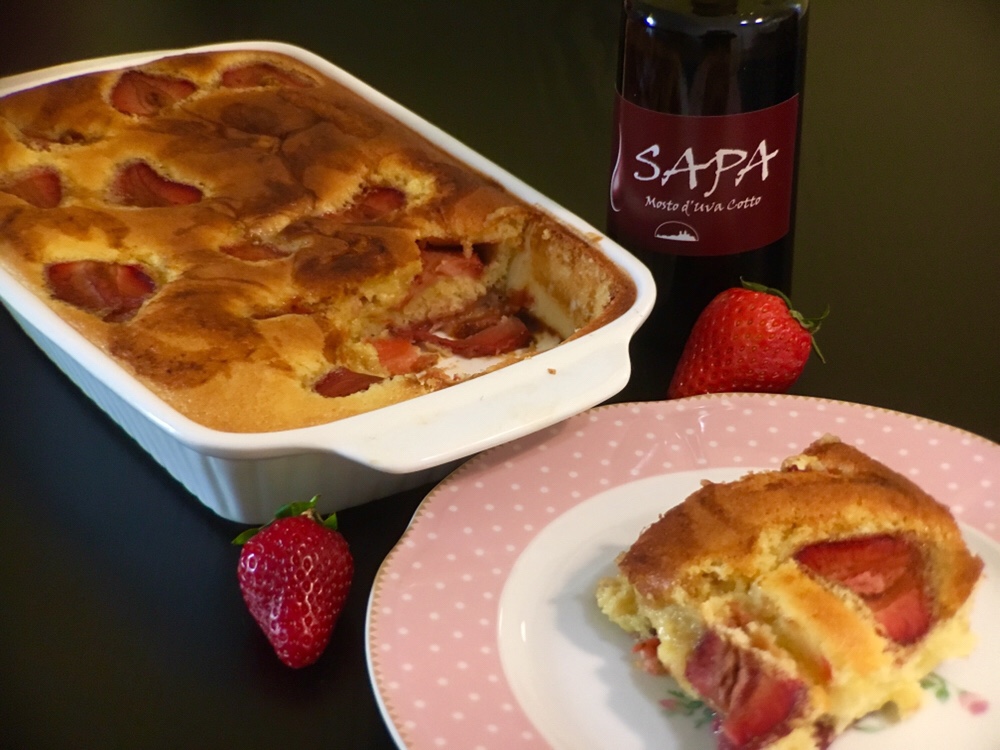È sempre un grande piacere ospitare di nel mio blog le mie amiche di Tasting Marche e i loro fantastici prodotti. Questa Boutique dei Prodotti Marchigiani (come troverai scritto nel loro sito visitandolo) la conosci già, è già passata da CucinaVitali nell’articolo Ben arrivate in tavola Marche . Ci conoscemmo in quell’occasione e la nostra amicizia sta continuando. Forse perché ci accomuna la passione per i prodotti marchigiani che vogliamo far conoscere anche a te, con tre ricette, ciascuna con un prodotto diverso della selezione di Tasting Marche. Si inizia con questo clafoutis di fragole alla sapa. Dolce di origine francese, la versione più classica è con le ciliegie, ma si può fare anche con altre qualità di frutta, come ad esempio delle fragole. Le ho marinate con la sapa, un meraviglioso sciroppo di mosto d’uva cotto che si può tranquillamente associare all’idea che ognuno di noi ha di un elisir. Usato dai nostri antenati come dolcificante quando lo zucchero bianco o di canna non esistevano, possiede anche nel carattere delle note acide che sono perfette per stemperare il dolce dell’impasto di questa ricetta che assomiglia ad una crepe. Sono sicura di averti incuriosito a provarlo e se solo potessi raccontarti il profumo attraverso la scrittura, non impiegheresti più di 5 minuti a a reperire tutti gli ingredienti che ti servono, che sono…