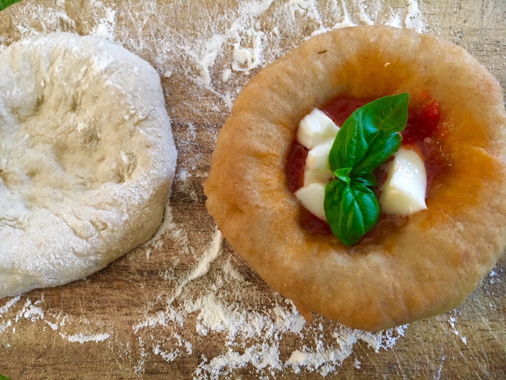 Sfiziosissime pizzette fritte, sono quelle che, per intenderci, quando si va a mangiare in una tipica pizzeria napoletana arrivano se chiedi i fritti misti alla napoletana. Le adoro, ci impazzisco, con quel sughetto di pomodoro fresco e basilico. Si spolverano poi di formaggio, alcuni mettono parmigiano, altri mozzarella, io ho scelto la seconda opzione, mozzarella vaccina. Sull’impasto mi soffermo, perché davvero merita! È composto da due farine derivanti da due grani antichi tipici della mia zona delle Marche, il Solina e lo Jervicella. Il primo Solina è in realtà di origine abruzzese. Viene coltivato solo in quota, nelle zone interne, dove il clima è più rigido la quota va dai 600 mt ai 1.400 mt, nelle zone dove il clima è più temperato l’altezza minima per dare corso alla coltivazione non scende mai sotto i 750 mt. Non privo di glutine ne possiede comunque in minore quantità rispetto al grano comune e ha invece, rispetto allo stesso, un contenuto proteico più alto.