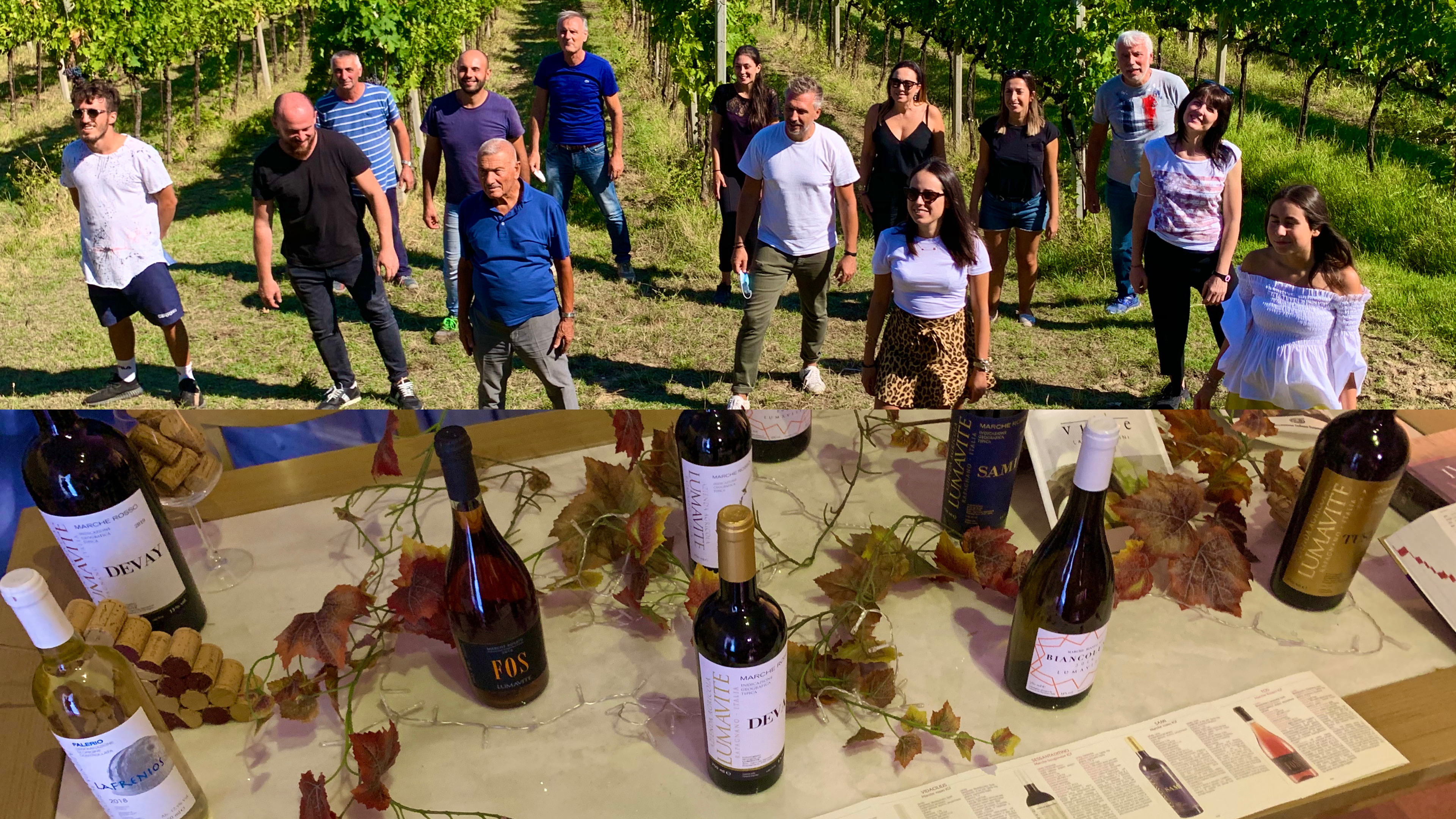 un panorama stupendo che va dal mare ai Monti Sibillini, noterai che i filari sono di syrah, montepulciano, sangiovese e l’ultimo ettaro a destra è un misto di rosso e bianco. Data di nascita 2002 (quest’anno Lumavite è diventata maggiorenne), 2 anni dedicati alla sistemazione della vigna, sedicesimo anno questo 2020 di vendemmia in cui, in una domenica di festa, buon cibo, convivialità, musica, la cantina ha deciso di coinvolgere anche persone non propriamente addette ai lavori. Forbici in mano, cappello in testa per proteggersi dal sole, allegria nel cuore, alle 10.30 del mattino è partita la spedizione attraverso i filari fino a raggiungere quelli del montepulciano in purezza che nasce in una parte in cui il terreno diventa più calcareo.