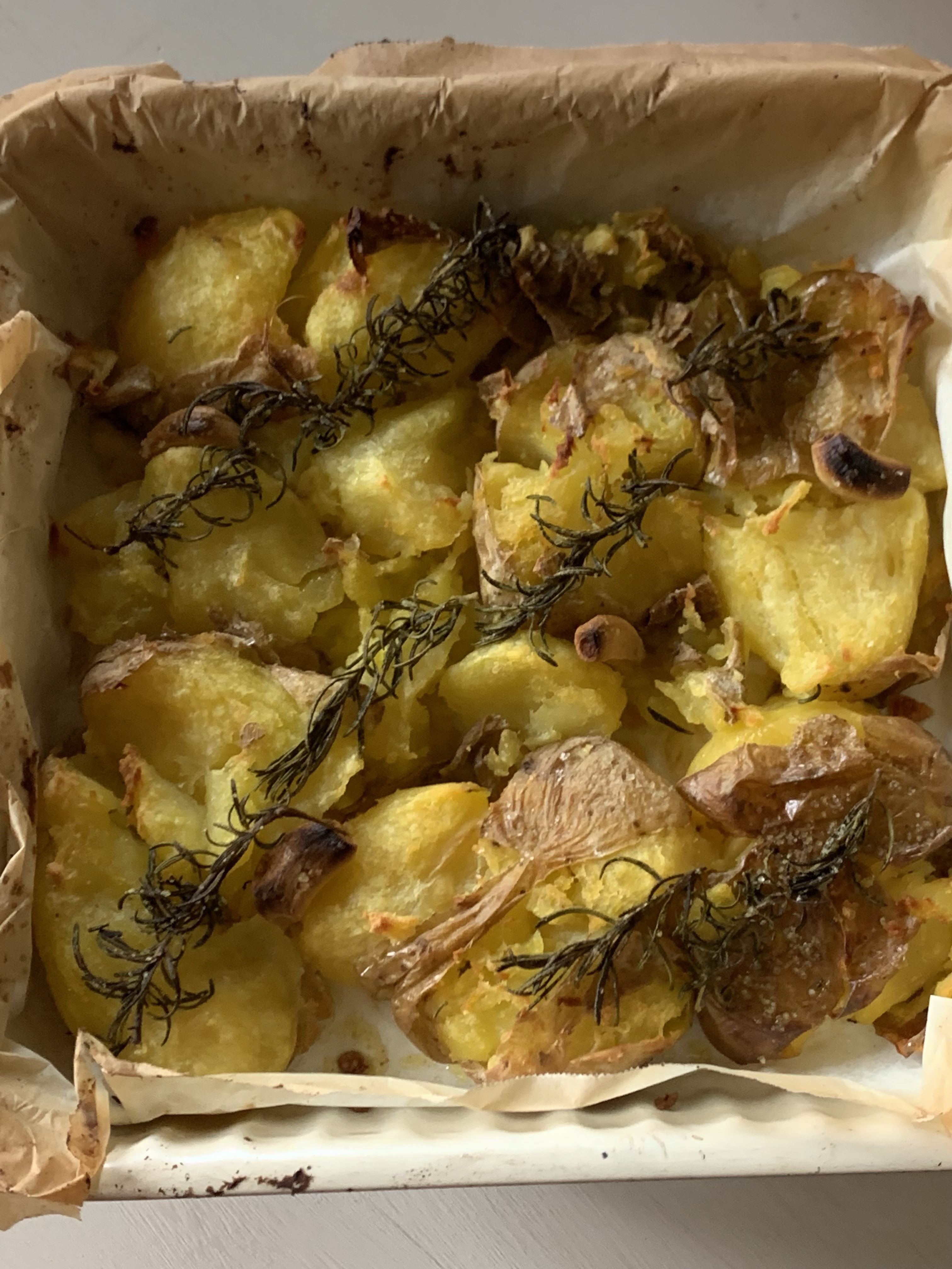 - quando avrai schiacciato tutte le patate condiscile con olio extravergine di oliva, sale, rosmarino (e aggiungi pure qualche altra spezia a tuo piacimento che ci stia bene)